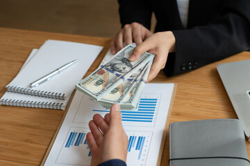 Bribery concept, a woman gives a bribe to an employee of the company for signing a contract