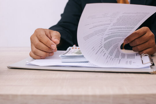 Businessman receive stacked money offered in file. Anti bribery and corruption concepts