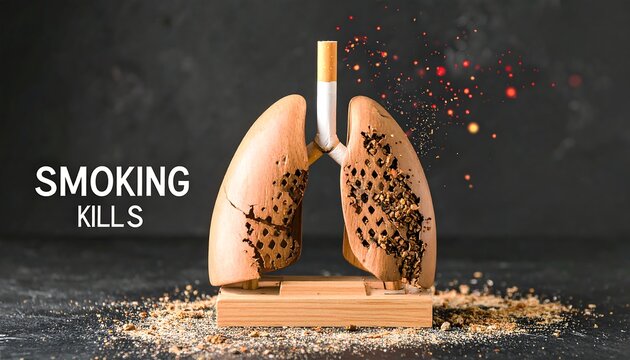 Damaged wooden lungs with cigarette, illustrating the harmful effects of smoking and lung disease