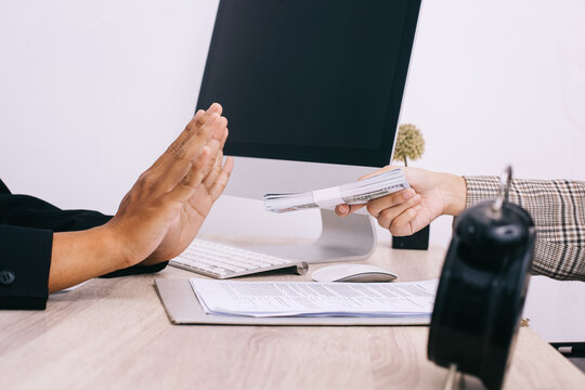 Hand showing stop gesture to refusing bribe money at the office. Worl anti corruption day concept