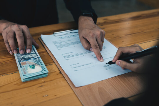 Corruption Concept, Government officials are accepting corruption payments that businessmen deliver.Politician hands taking bribe money under office table, lobbying of interests