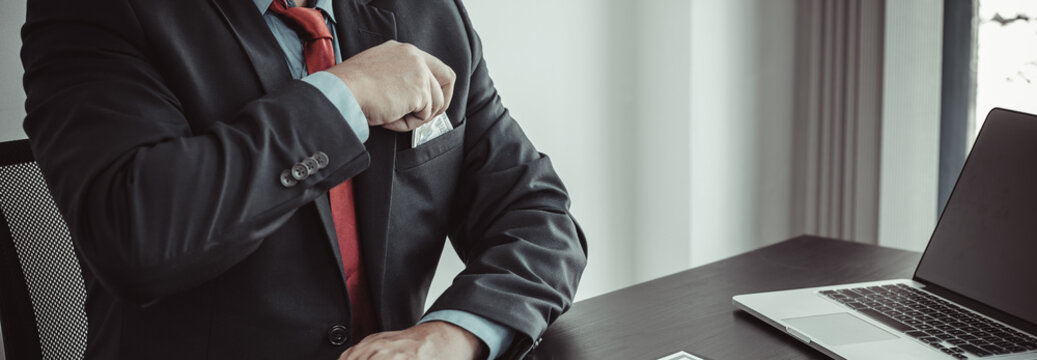 Businessmen give dollars under the table to bribe employees in signing contracts for the purchase of illegal land and real estate, Business fraud and social injustice, corruption and bribery concept.
