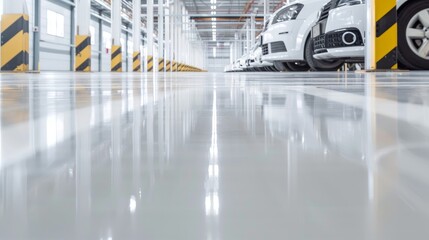 Resilient epoxy resin flooring in an industrial setting, highlighting its tough and durable qualities, clean and shiny appearance, perfect for heavy traffic areas