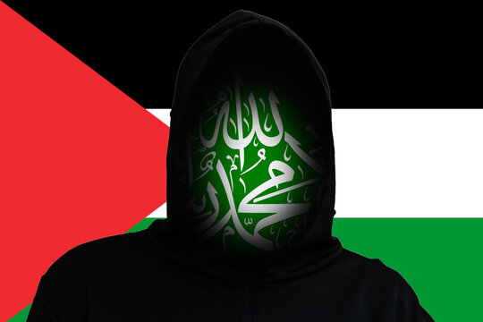 Incognito terrorist on the Flag Palestine background. Hamas between Israel and Palestine. Israel Palestine war. World crisis in Middle East. Rebellion. Rebel militant terrorist guerrilla concept