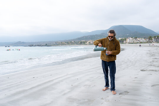 Portrait of a mature Latin man relaxed drinking yerba mate on the beach
