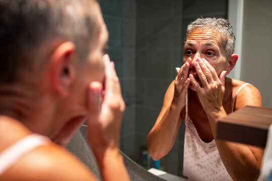 Senior woman applying skincare in bathroom