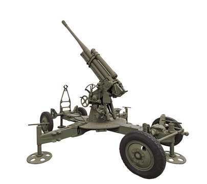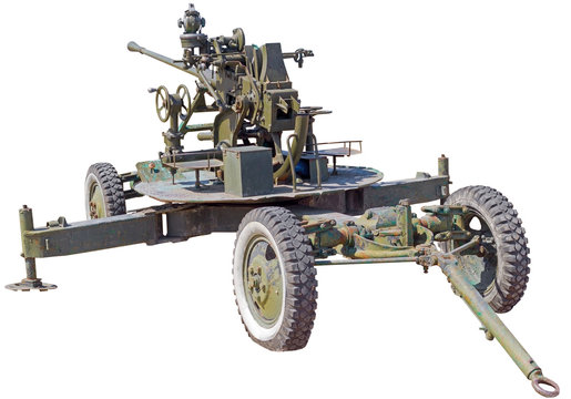Anti-aircraft machine gun of the World war II. War industry. Personal train in motion. Weapons theme. Exposed artillery.