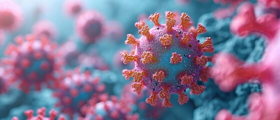 3D illustration showing virus particles and Y-shaped antibodies in a dynamic, close-up view, using vibrant colors on a dark background