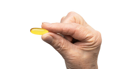 Senior female hand holding one yellow omega-3 capsule, fatty acids, fish oil supplements, isolated on a transparent background