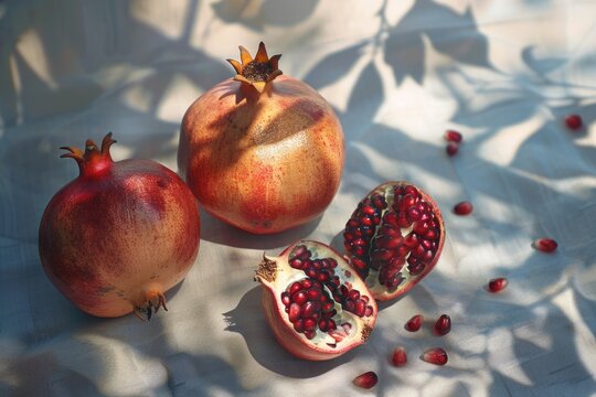 Two pomegranates and one cut open on a table. Suitable for food and nutrition concepts