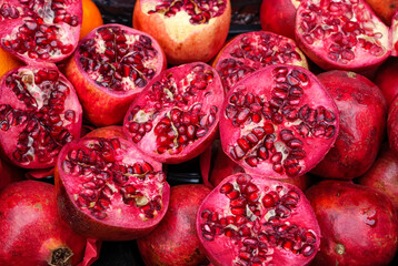A pile of ripe pomegranates cut in half revealing their jewel like red seeds a beautiful and healthy fruit that is rich in antioxidants