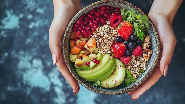 Hands hold a bowl filled with fresh fruit, granola, and seeds, showcasing a colorful and healthy breakfast or snack option.