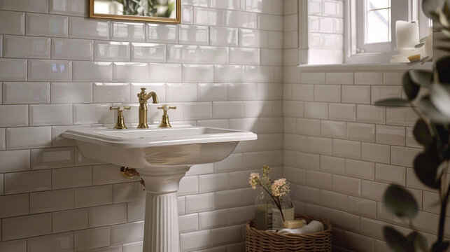 A vintage-inspired bathroom featuring subway tiles, a pedestal sink, and brass hardware for a timeless look