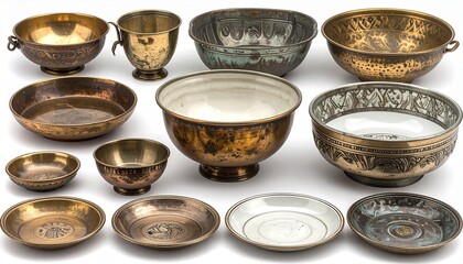 Many different bright multicolored ceramic bowls and cups handcrafted. Top view. View from above. Background texture