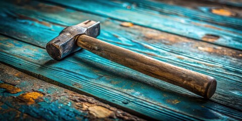 A weathered hammer rests on a rustic teal wooden surface, showcasing its aged texture and the craftsmanship of its wooden handle.