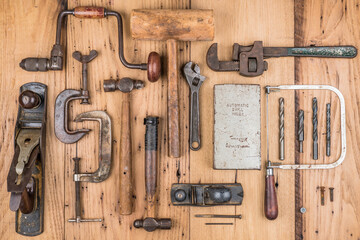Vintage hand tools and equipment on wooden surface