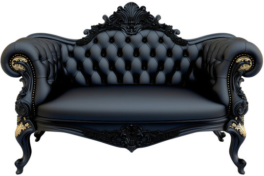 Black leather victorian baroque loveseat, gold accents, diamond tufted upholstery, carved wooden frame, isolated on transparent background.