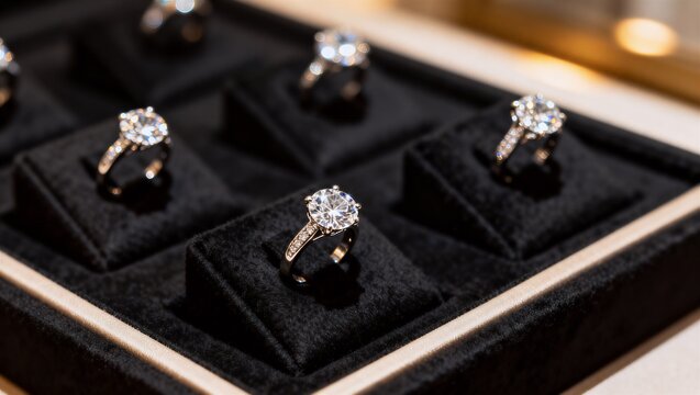 ベルベット台に並ぶ高級ダイヤモンドリングの輝きを捉えたジュエリーショーケース接写写真