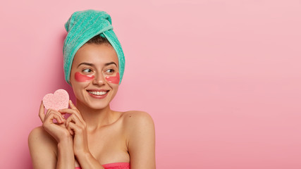 Portrait of lovely young woman uses eye patches for skin treatment, looks healthy and pleased, holds little cosmetic sponge for removing makeup, looks aside right with thoughtful happy expression