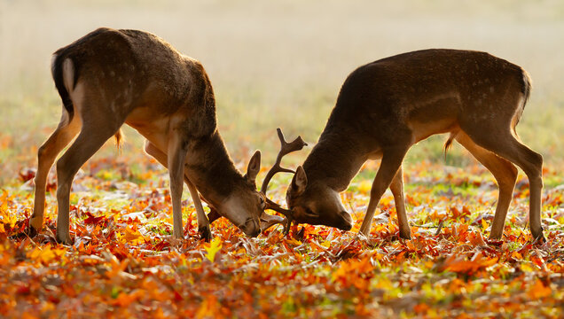 Young Fallow deer stags practice fighting during the rutting season in autumn