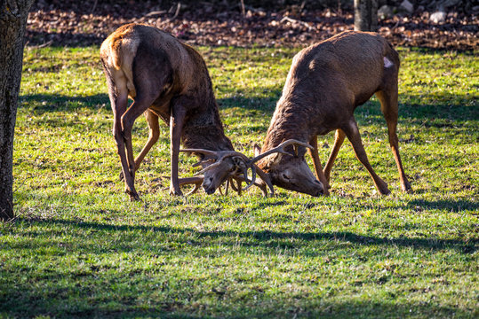 Magnificent Elk Bulls Battling Locking Horns Antlers Collide Rut Fight