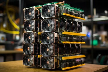 Computer Cryptocurrency Mining Rig Illustration with Multiple Antminers and a Large Power Supply Unit Illustration