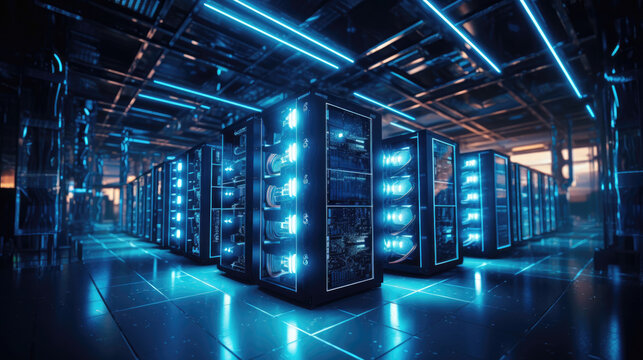 Bitcoin and crypto mining farm. Big data center. High tech server computers at work