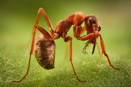 Leafcutter ants carrying green leaf fragment across forest floor macro closeup