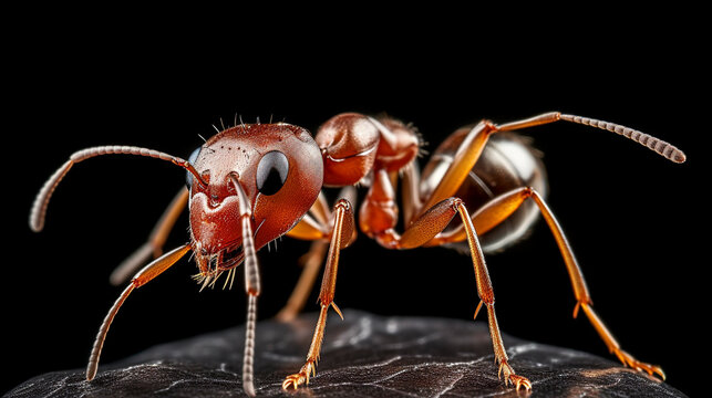 Close up of forest ants guarding the entrance to the ant burrow in a crevice in the wood
