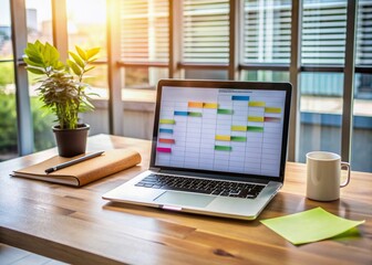 Modern office desk with laptop, papers, and colorful sticky notes, displaying a Gantt chart software, planning and tracking project timelines, deadlines, and tasks.