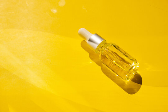 Dropper glass bottles with pipette. Transparent hyaluronic natural beauty product and eco serum skin care concept. Top horizontal view copyspace