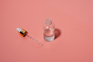 Dropper glass bottles with pipette. Transparent hyaluronic natural beauty mineral product and eco serum skin care concept. Top horizontal view copyspace. Summer juicy colors.