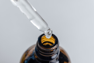 Dropper glass bottles with pipette. Transparent hyaluronic natural beauty product and eco serum skin care concept. Top horizontal view copyspace