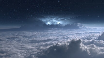 new high-altitude scene, anvil cloud top in the lower part of the frame, richly detailed, its surface illuminated by softer, irregular, diffuse cool-toned glows emanating from.