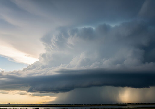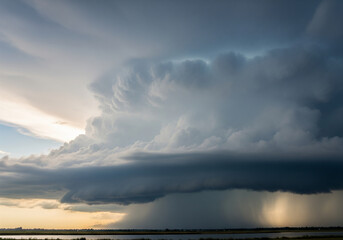 A dramatic supercell thunderstorm forms in the sky, with a massive anvil top and a heavy rain shaft pouring down onto the landscape below