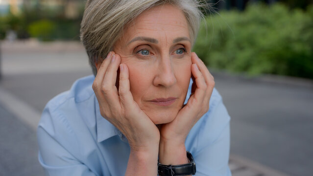 Upset disappointed thoughtful face pensive senior business woman sorrowful Caucasian sad old mature 60s middle-aged female businesswoman employer think problem depressed anxiety thinking city outdoors