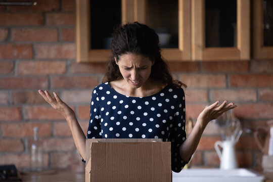 Unhappy anxious young latin woman unboxing carton parcel, dissatisfied with wrong item or smashed order, disappointed with low quality delivery service, negative online shopping experience concept.