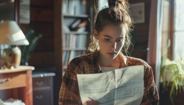Young woman reading financial documents while in motion feeling anxious
