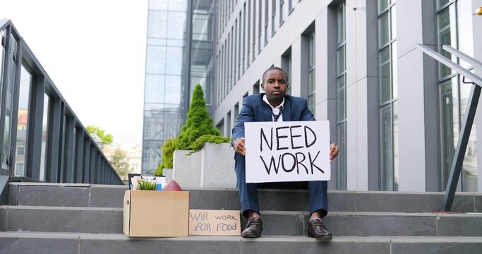 African American young sad and depressed man in despair sitting on stairs in city, showing poster Need work and Will work for food. Workless male looking anxious in depression Unemployment at lockdown