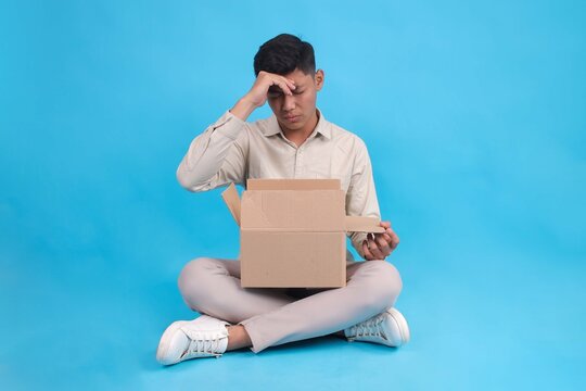Frustrated Man Sitting and Holding Opened Box Feeling Confused and Disappointed with Delivery