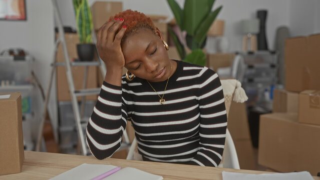 Young african american woman holds forehead with one hand at desk surrounded by packed cardboard boxes in building; stress.