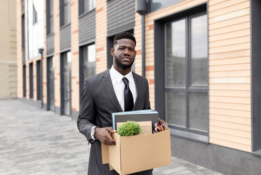 Fired african american male office worker with box of personal stuff lost job and left without money, going home. Businessman standing near modern office building. Unemployment concept