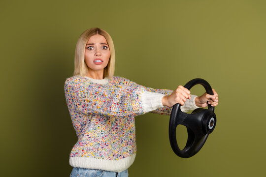 Nervous lady driver with worried expression afraid to drive car by herself for first time or having car accident on road. Generative AI