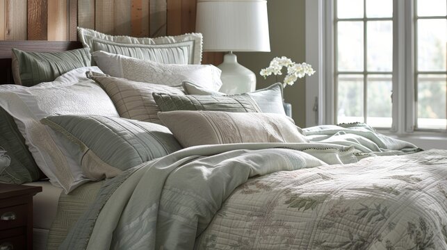 The mix of soft muted colors and various textures in this bedding ensemble create a serene and sophisticated look for any bedroom.