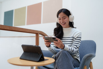 Woman stretching arm raised sitting incorrect position at home office desk. Young asian woman tired from work body stress back pain office syndrome. freelance Female work from anywhere using laptop