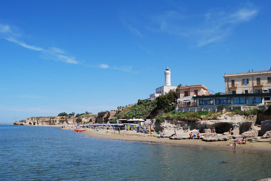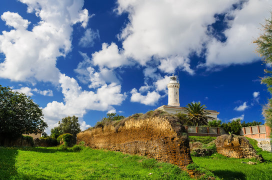 The ruins of the Imperial Villa (Villa Imperiale) and the lighthouse in Anzio, Italy