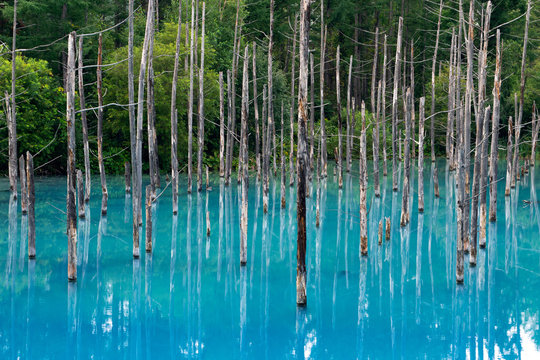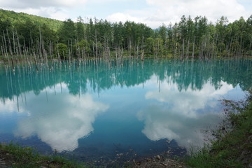 Blue pond "Aoi ike" in Biei, Hokkaido, Japan.