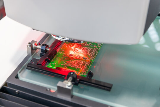 Automated optical inspection of printed circuit board - PCB under red light in high-tech electronics manufacturing process