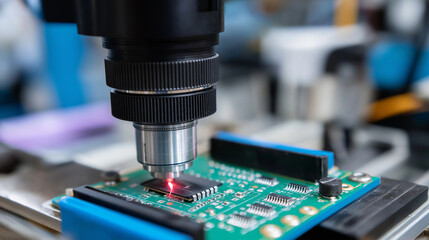 High-tech optical inspection machine uses blue laser for scanning complex circuit board defects in advanced manufacturing environment