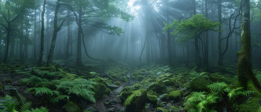 Eerie Aokigahara Forest in Mist: Long Exposure for Supernatural Paranormal Day Ambience